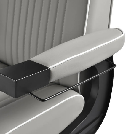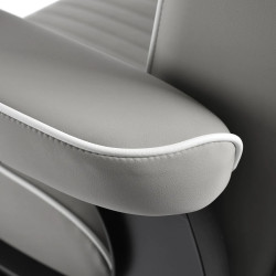 Sitsen, fylld med mjukt skum, ger komfort även under långa behandlingar, medan det ergonomiskt profilerade ryggstödet stödjer ryggen. Den fullständiga rotationsmekanismen ökar rörelsefriheten och möjliggör enkel åtkomst från alla sidor, vilket underlättar stylistens arbete. De stoppade armstöden, inställda på optimal höjd, stöder naturlig armposition och minskar spänningar i axlar och nacke. En extra praktisk detalj är handdukshållaren under vänster armstöd, vilket underlättar arbetsorganisationen.