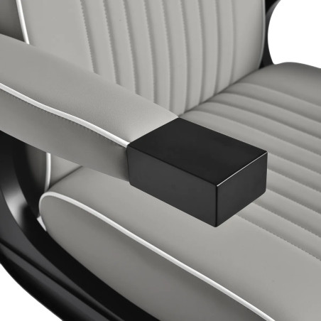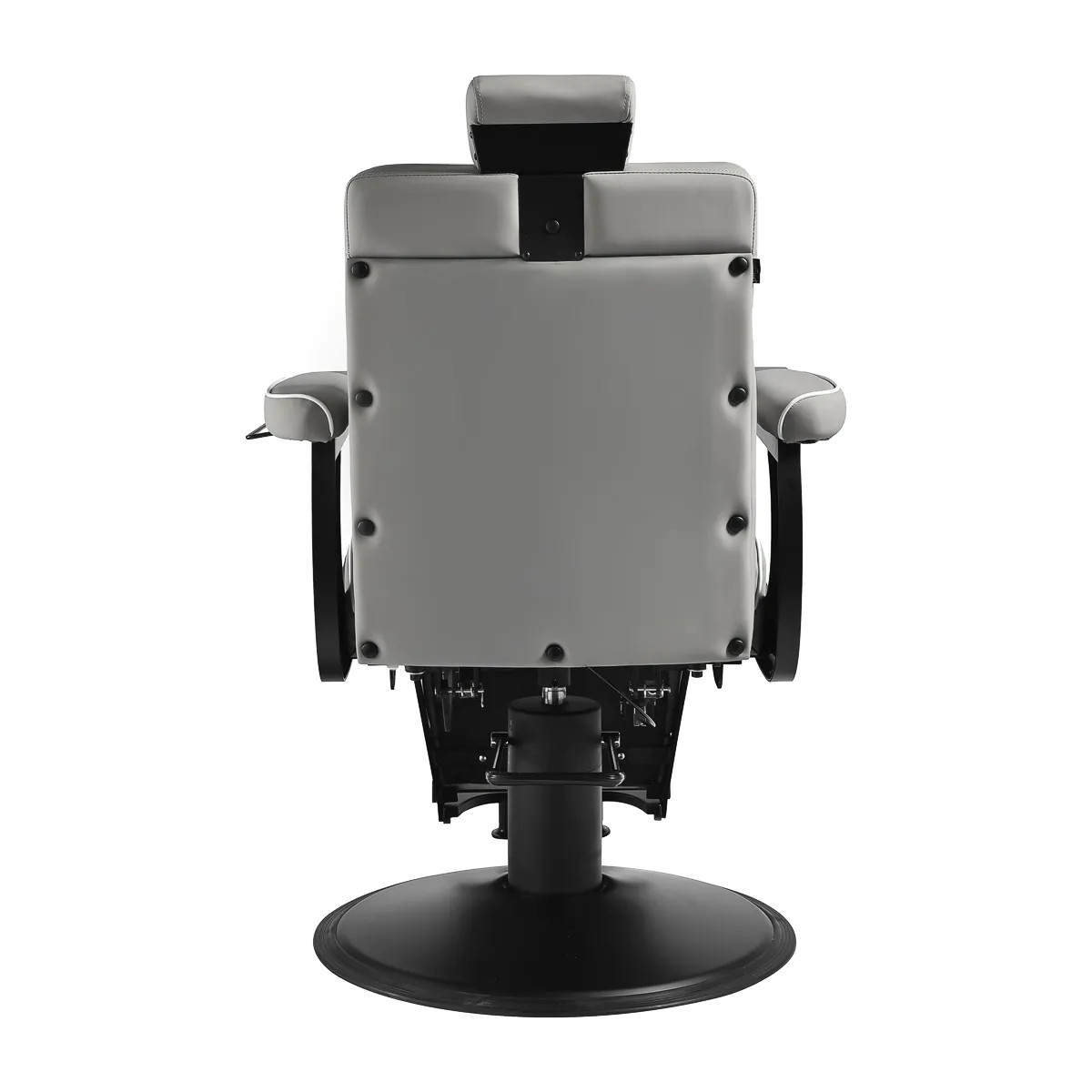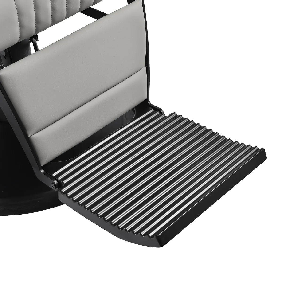 Den svarta, runda basen garanterar stabilitet och hållbarhet. Den mjuka, matta klädseln i ljusgrått konstläder kombinerar komfort med slitstyrka. Materialen är fuktbeständiga, hållbara och enkla att rengöra. Noggrant sydda detaljer och den ljusgrå klädseln ger stolen en modern och stilren karaktär som kompletterar inredningen i barbersalonger. Kombinationen av ljusgrå klädsel med svart ram och bas framhäver stolens eleganta och professionella design.