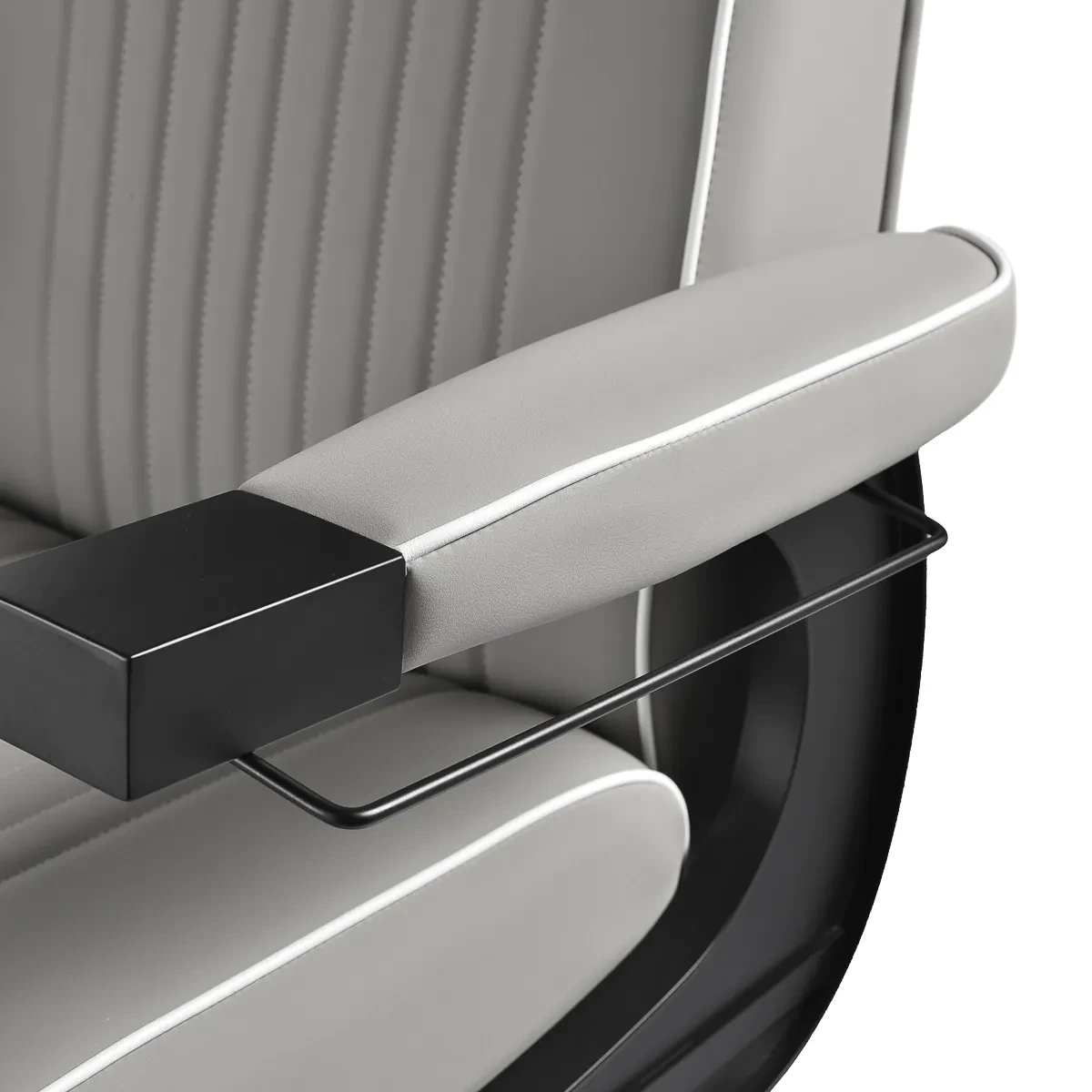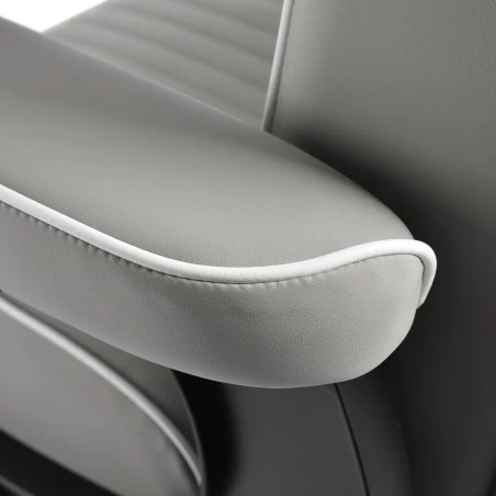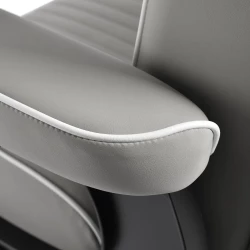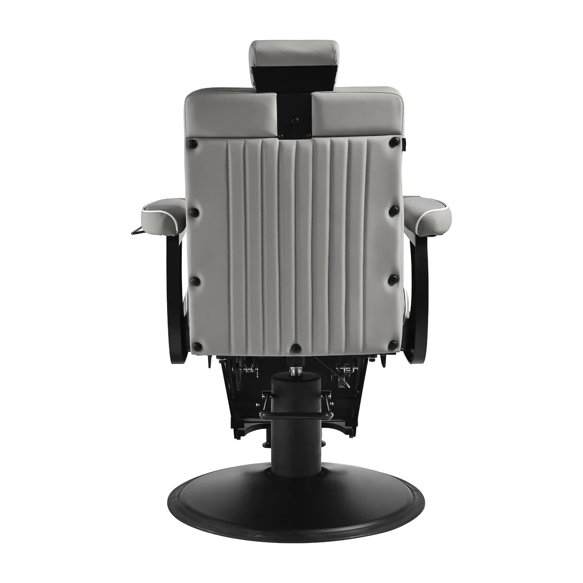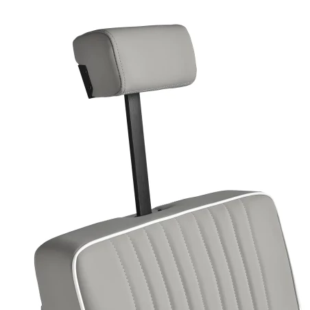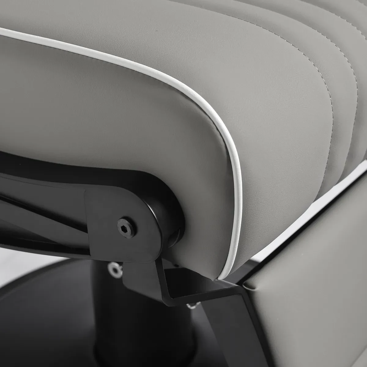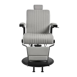 Den runda basen i svart finish säkerställer stabilitet och hållbarhet. Klädseln i mjukt, matt konstläder är slitstark, fuktresistent och enkel att rengöra, vilket gör stolen idealisk för daglig användning i professionella miljöer. De eleganta sömmarna och den grå färgtonen ger stolen en exklusiv karaktär som passar perfekt i moderna barbersalonger. Kombinationen av grå klädsel och svart ram förstärker det professionella och stilrena helhetsintrycket.