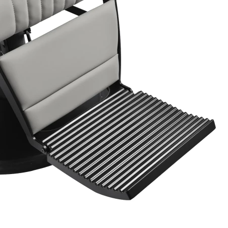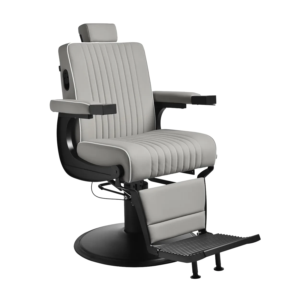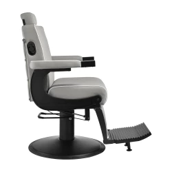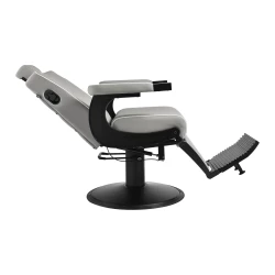 Elegant och ergonomisk barberstol med hydraulisk justering, justerbart rygg- och fotstöd samt exklusiv design – perfekt för moderna barbersalonger.