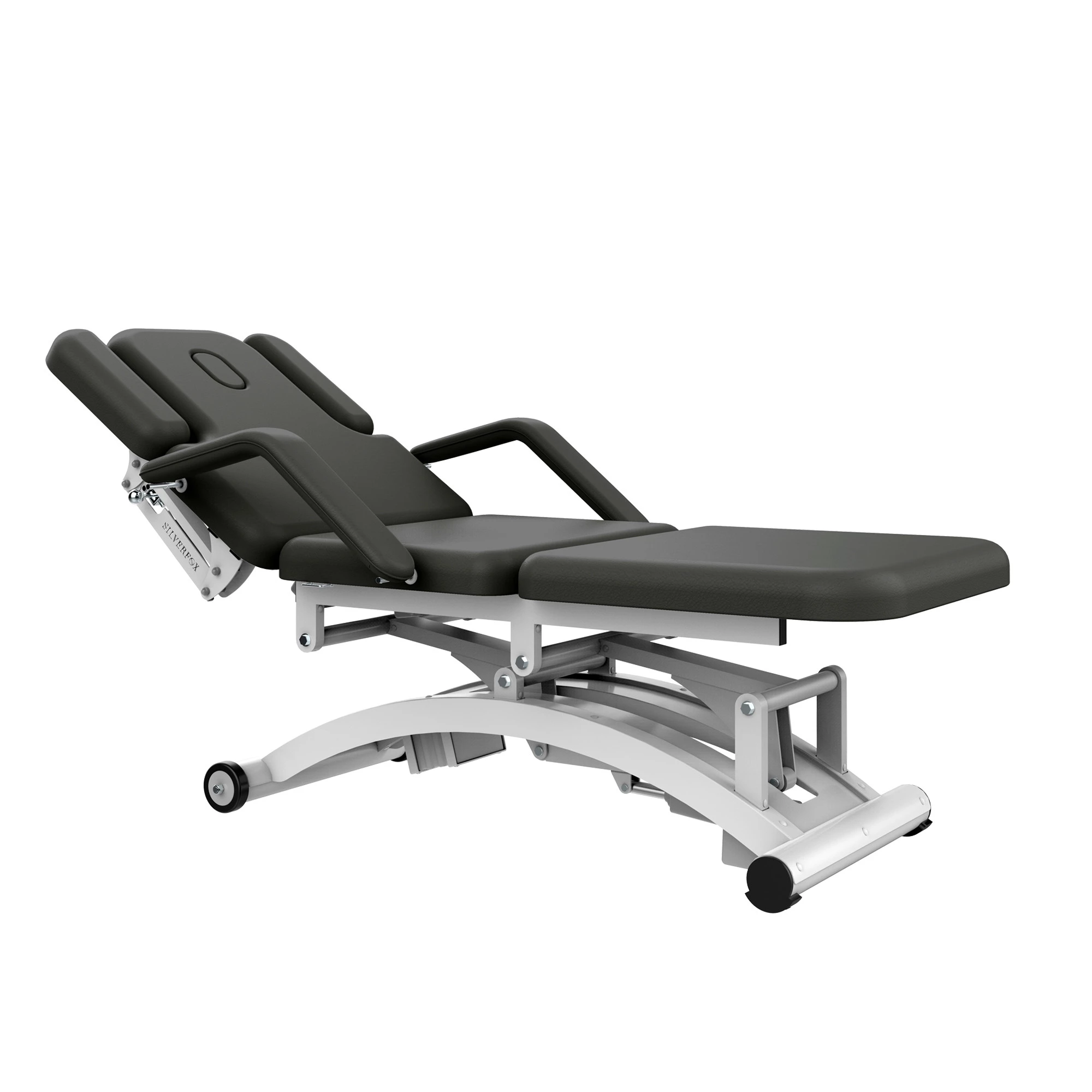 Ryggstödet justeras elektriskt med en lutning från –20° till +65°, och mittsektionen kan vinklas för ytterligare behandlingsanpassning. De övre armstöden är justerbara och sidarmstöden kan enkelt tas av vid behov, vilket ger bättre åtkomst och flexibilitet under behandlingar.