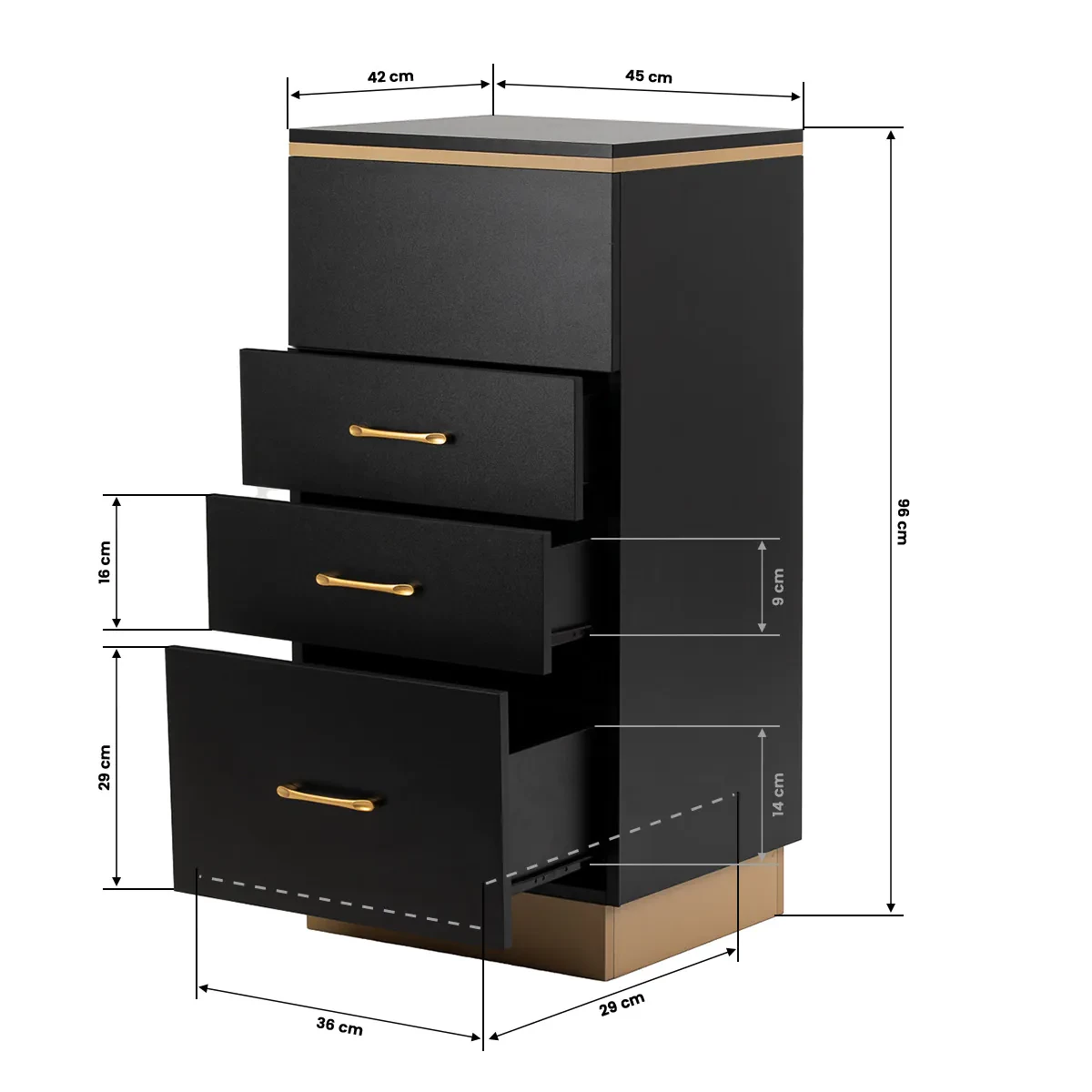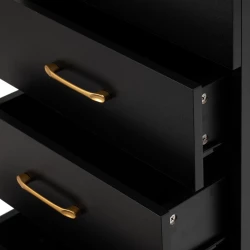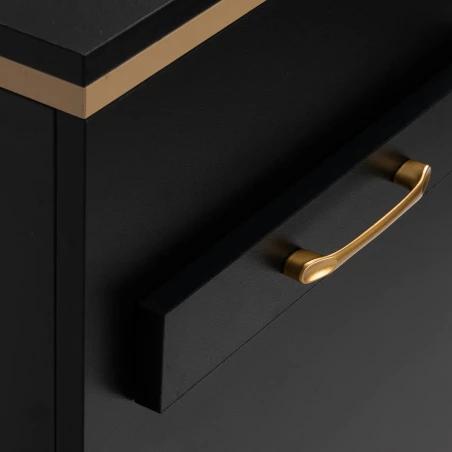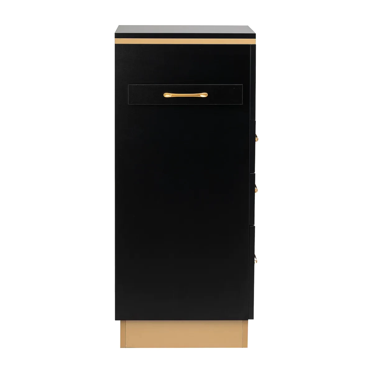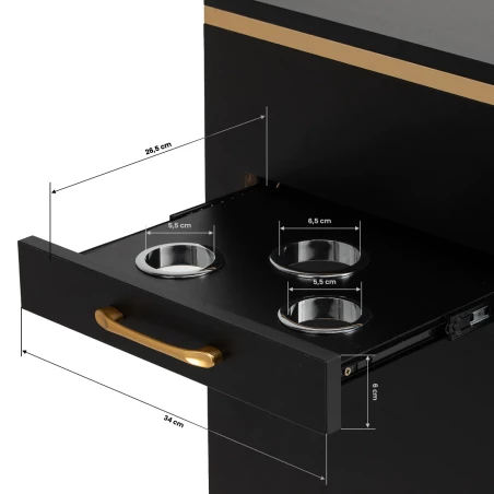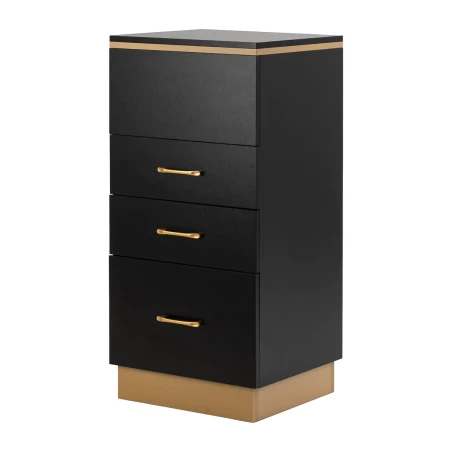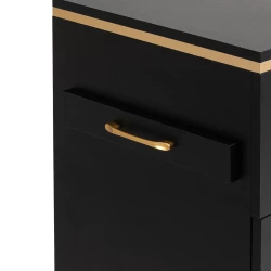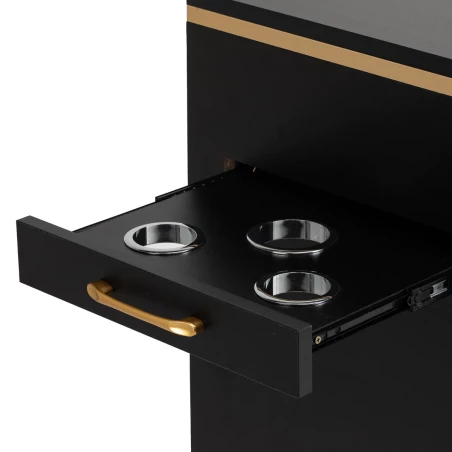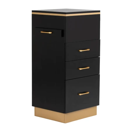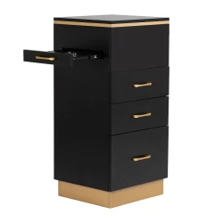 2027G frisörassistent är en praktisk och stilren möbel som effektiviserar det dagliga arbetet i professionella frisörsalonger. Den minimalistiska designen i svarta nyanser, kompletterad med exklusiva gulddetaljer, ger ett sofistikerat och modernt uttryck som lyfter salongens helhetsintryck.