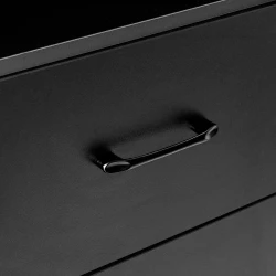 Den stabila konstruktionen säkerställer lång hållbarhet, samtidigt som de släta ytorna gör möbeln enkel att rengöra. Det tidlösa färgschemat passar både minimalistiska och mer uttrycksfulla salongsinredningar. Svarta handtag förstärker det eleganta utseendet och ger en smidig och bekväm användning av skåp och lådor.