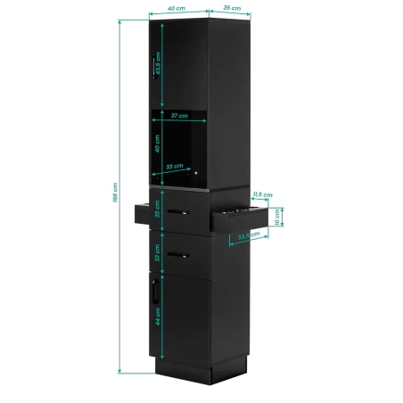 Gabbiano Totem frisörstation är en praktisk och stilren lösning för moderna frisörsalonger och barbershops. Den är designad med fokus på ergonomi och effektiv arbetsorganisation, vilket gör den till ett perfekt arbetsredskap i en professionell miljö. Den minimalistiska designen i svarta nyanser, kompletterad med eleganta gulddetaljer, ger ett exklusivt och sofistikerat intryck.