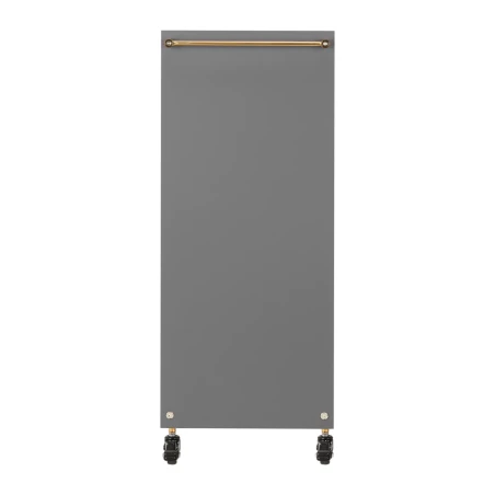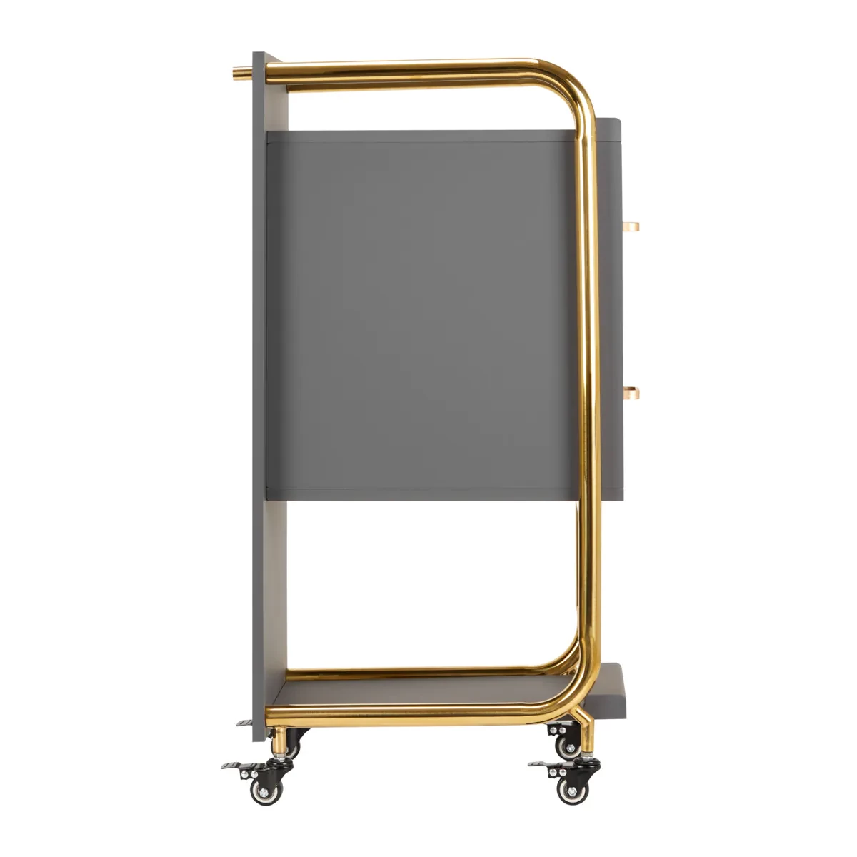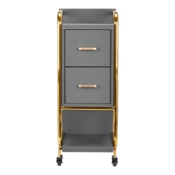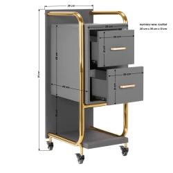 De gummiklädda hjulen med broms gör assistenten enkel att flytta och stabil att placera exakt där den behövs under behandlingar. Den genomtänkta konstruktionen kombinerar praktisk funktion med en elegant design – gråtonade träpaneler tillsammans med polerade metallelement i guldfärg ger ett exklusivt och professionellt intryck som passar i alla typer av salongsinredningar.