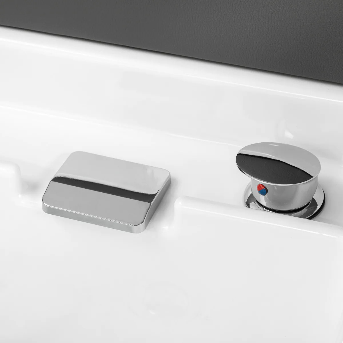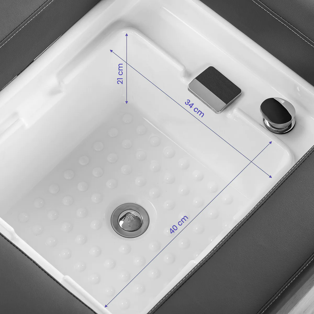 Tvättstationen är utrustad med blandare, justerbar dusch och avtappningsplugg med sil för optimal hygien. Vattenanslutningar och avlopp är diskret dolda, vilket skapar en stilren helhet. Den medföljande fotpallen ger extra komfort för personalen, medan det inbyggda skåpet under stolen erbjuder bekväm förvaring av produkter och tillbehör.