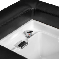 Tvättstationen är utrustad med blandare, justerbar dusch och avtappningsplugg med sil för optimal hygien. Vattenanslutningar och avlopp är diskret dolda, vilket skapar en stilren helhet. Den medföljande fotpallen ger extra komfort för personalen, medan det inbyggda skåpet under stolen erbjuder bekväm förvaring av produkter och tillbehör.