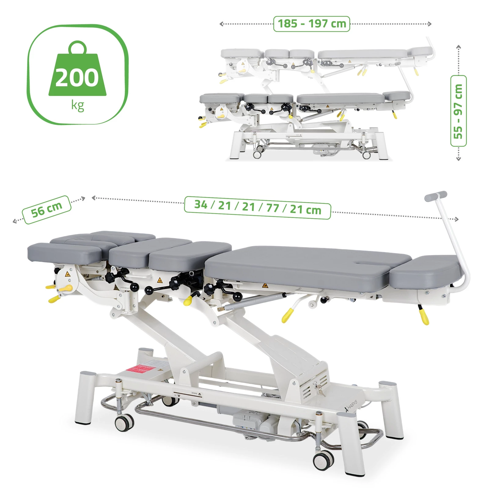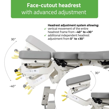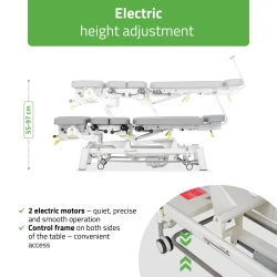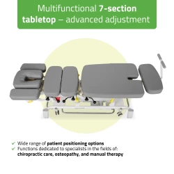 Avancerad 7-segments elektrisk kiropraktorbänk med drop- och dragfunktion. Utvecklad för fysioterapi, osteopati och manuell terapi.
