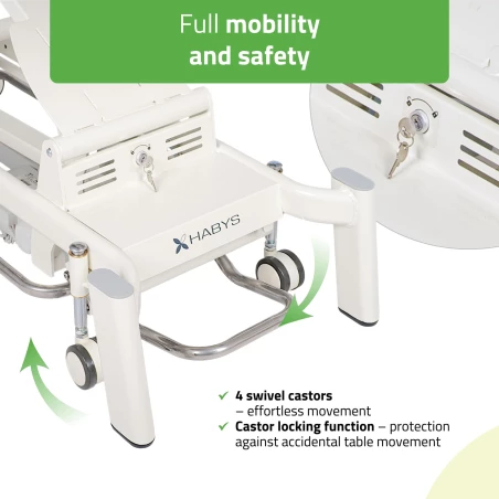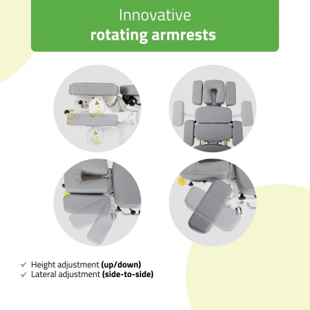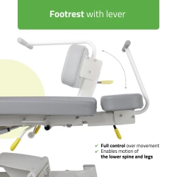 Elektrisk höjdjustering styrs via gångfri fotkontroll i rostfritt stål och kombineras med en stabil stålram som ger trygg och exakt arbetsmiljö i det dagliga behandlingsarbetet.
