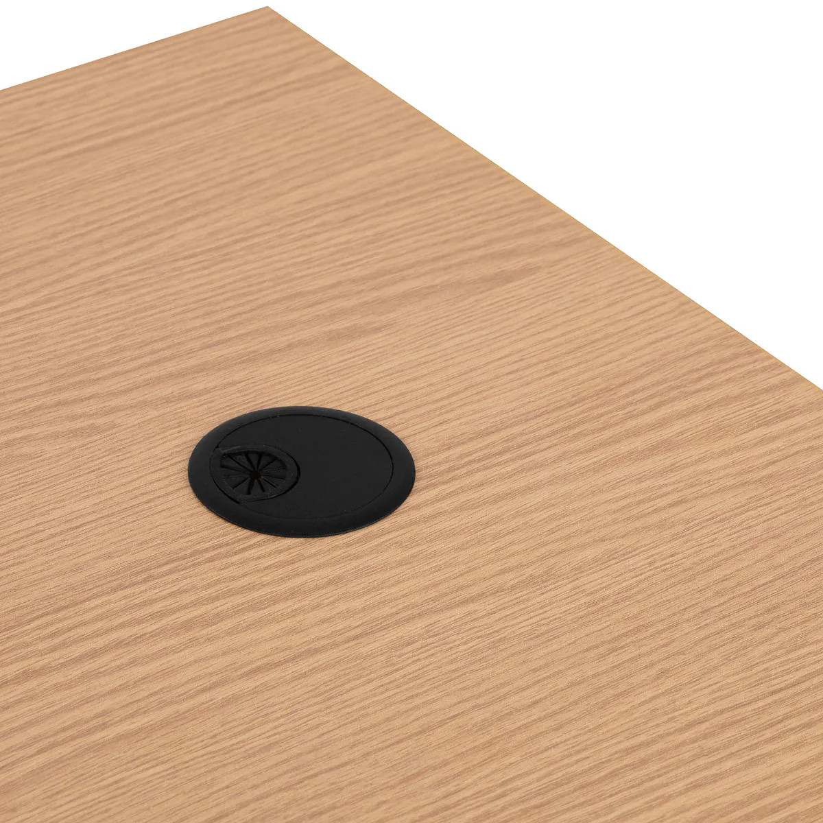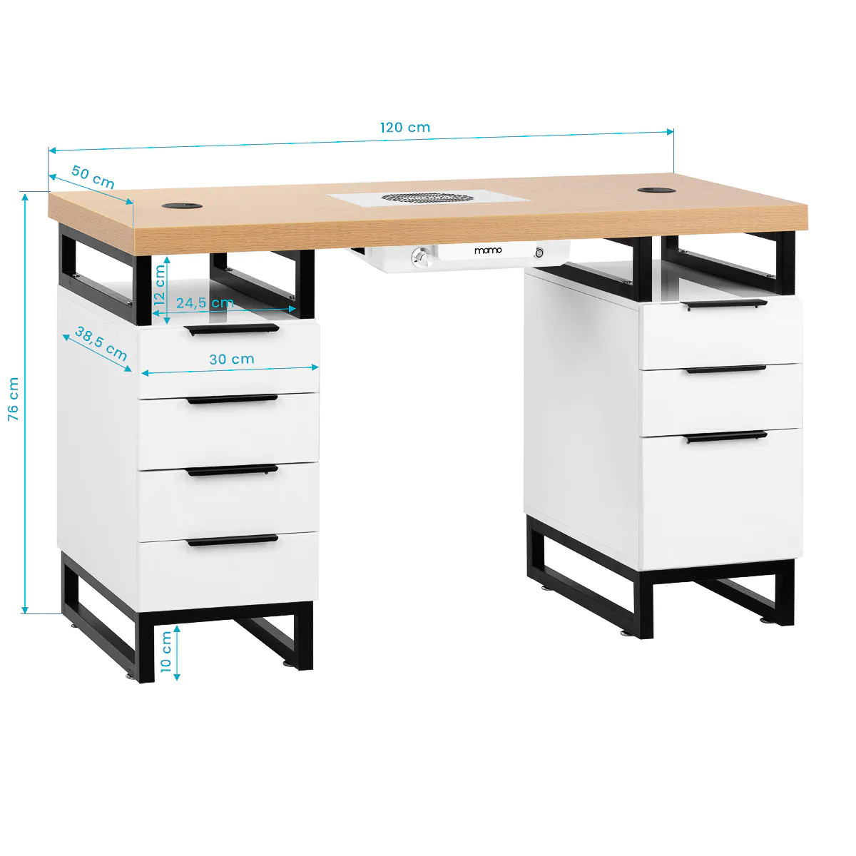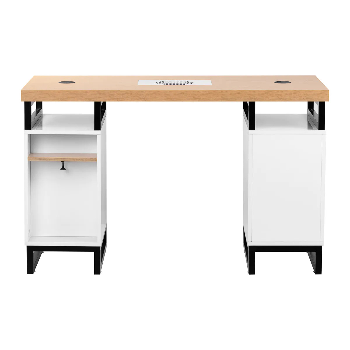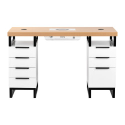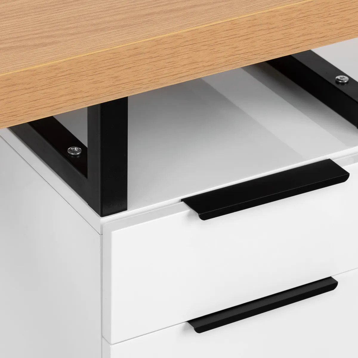 Den kombinerade färgsättningen med trätonad skiva, vita fronter och svarta metallramar samt handtag skapar ett modernt men professionellt intryck. Kontrasten mellan skivan, de vita skåpen och svarta ramdetaljer ger bordet en elegant och stilren karaktär. Den stabila metallbasen garanterar hållbarhet och komfort även under långa arbetsdagar. Bordet passar lika bra i kompakta utrymmen som i rymligare salonger eller kontor med modern inredning.