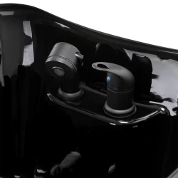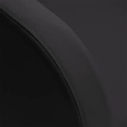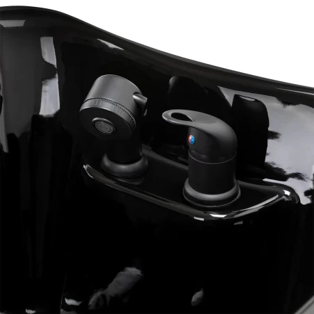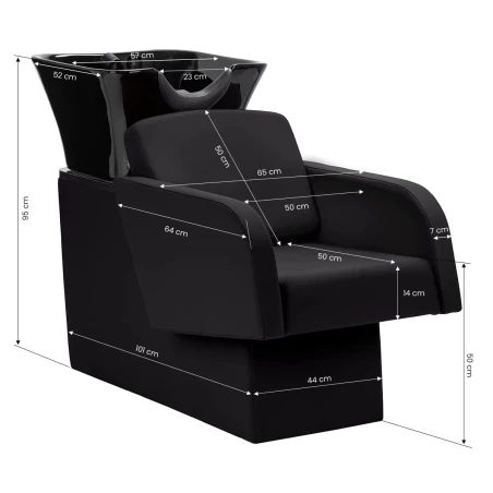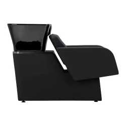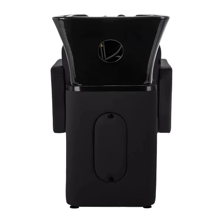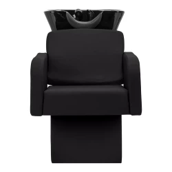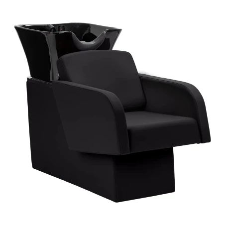 Den svarta keramiska skålen är djup och stilren, vilket minskar stänk och ger maximal komfort under hårtvätt. Den konturerade kragen och det vinklade ryggstödet ger optimalt stöd för klienten, och det svarta plastskyddet skyddar mot kylig keramik, vilket skapar en behaglig tvättupplevelse.