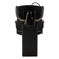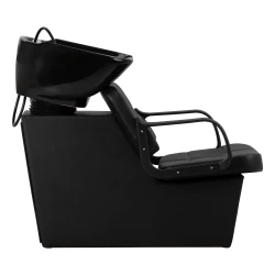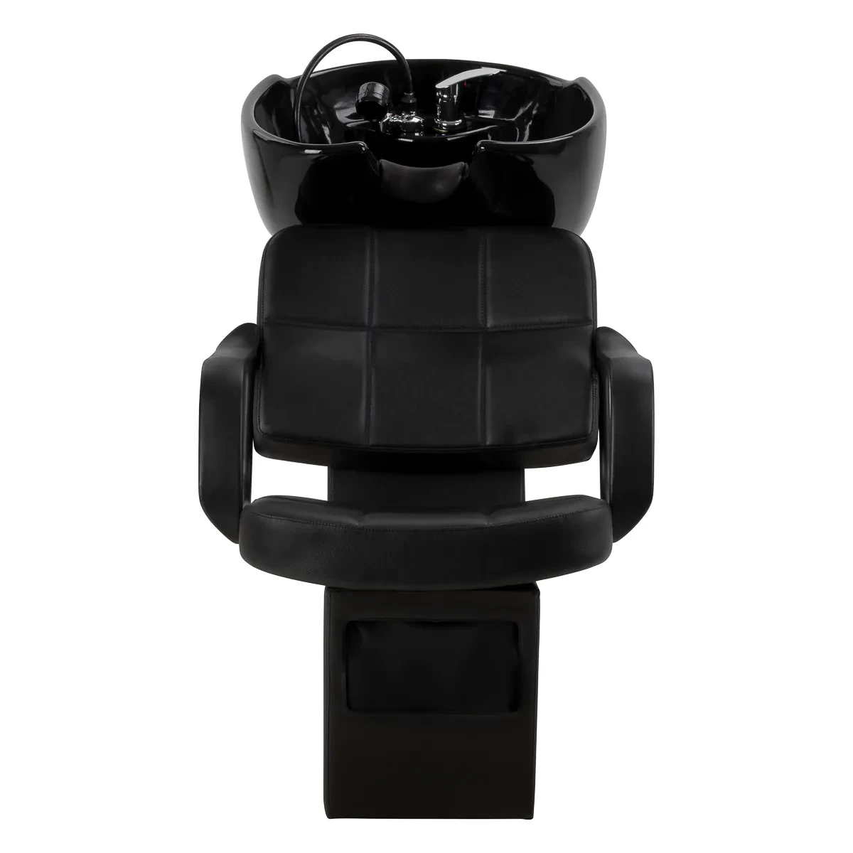 Ergonomisk och stilren hårtvättstation med vinklingsbar keramisk skål och slitstark konstläderklädsel – perfekt för moderna frisörsalonger och intensiv användning.