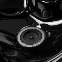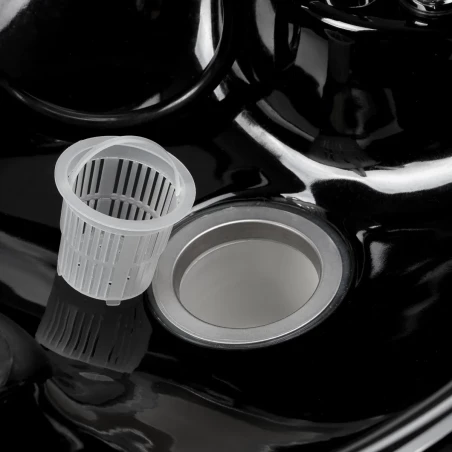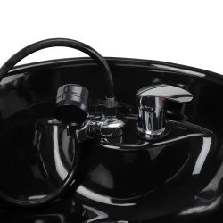 Den djupa keramikskålen i svarta nyanser minskar effektivt stänk från vatten och kosmetika och håller arbetsplatsen ren. Skålen är vinklingsbar för att anpassas till kundens längd och frisörens arbetsställning, vilket förbättrar ergonomin. Den slitstarka keramiken är resistent mot fläckar, repor och kemikalier, och den släta ytan underlättar rengöring och hygien. Konturerad nackkrage och plastskydd ger extra komfort och eliminerar känslan av kyla mot skålen.