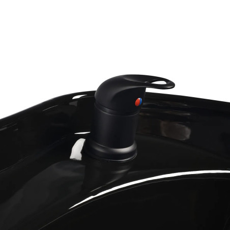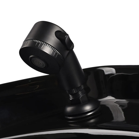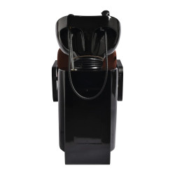 Det svarta keramiska handfatet har ett optimalt djup som förhindrar stänk av vatten och produkter under behandlingar. Den justerbara lutningen gör det enkelt att anpassa efter kundens position och behov. Materialet är slitstarkt, motståndskraftigt mot repor och missfärgningar samt mycket lätt att rengöra. Den konturerade kanten och det vinklade ryggstödet ger stabilt stöd och bekväm lutning under hårtvätt. Tack vare det mjuka svarta plastöverdraget upplevs inte den keramiska ytan som kall mot nacken, vilket ökar kundens komfort.