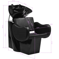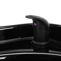 Den djupsvarta keramiska skålen minskar stänk från vatten och produkter under behandlingar. Skålen är justerbar i vinkel, vilket gör det enkelt att anpassa positionen efter individuella behov. Högkvalitativa material gör skålen hållbar, reptålig och enkel att rengöra. Den ergonomiskt formade kragen ger bekvämt stöd för huvudet, medan det mjuka svarta plastöverdraget eliminerar känslan av kyla från keramiken.