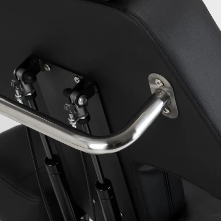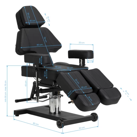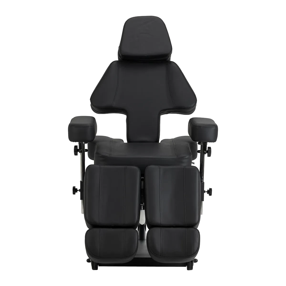Den minimalistiska designen och klassiska färgschemat i svarta nyanser smälter harmoniskt in i alla tatueringsstudior, medan deformationsbeständigt skum och högkvalitativt konstläder garanterar komfort, hållbarhet och enkel rengöring. Stolen har dessutom hjul på ena sidan av basen för enkel förflyttning.