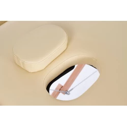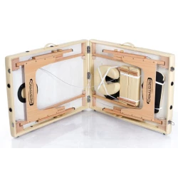 Bänken klarar en maximal belastning på 250 kg och är utrustad med ansiktsportplugg, avtagbar vadderad armstödsplatta och vinylklädsel för enkel rengöring. När den fälls ihop mäter den endast 100 × 70 × 20 cm och väger 13 kg (15 kg med tillbehör). Ett lättanvänt, robust och smidigt alternativ för mobila behandlingar.