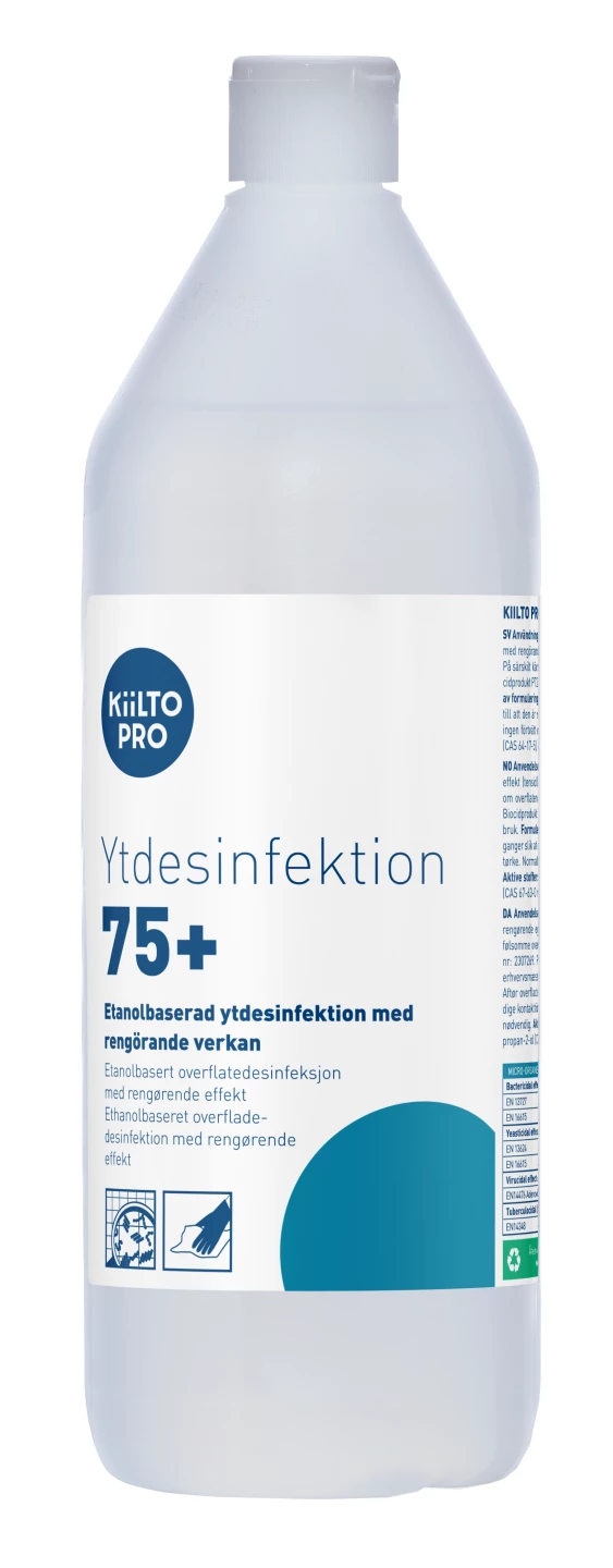 Kiilto Pro (föredetta DAX) Ytdesinfektion 75+ är baserad på 75 vol% denaturerad etanol samt tensid (smutslösare) och avsedd för desinfektion av släta ytor t.ex. bänkar, bord och undersökningsbritsar. Den är effektiv mot bakterier, jästsvamp och olika typer av virus som coronavirus, HIV, Hepatit B och C samt vissa nakna virus som Adenovirus och Murine Norovirus. Produkten verkar snabbt och effektivt utan att lämna spår på den behandlade ytan.